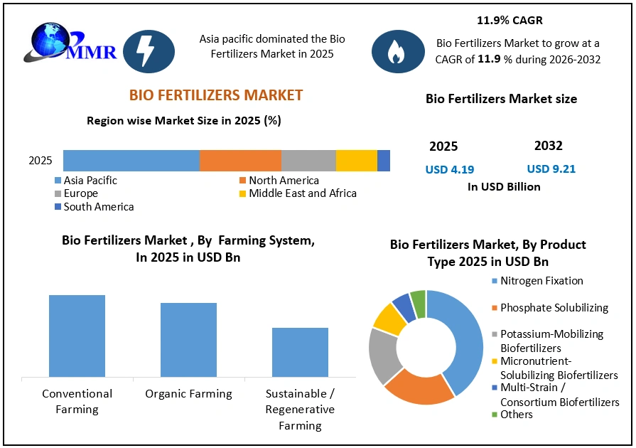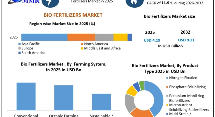 The global Bio Fertilizers Market is witnessing robust growth, driven by the increasing shift toward sustainable agriculture and organic food consumption. Valued at USD 4.19 billion in 2025, the market is projected to reach nearly USD 9.21 billion by 2032, expanding at a strong CAGR of 11.9% during the forecast period.