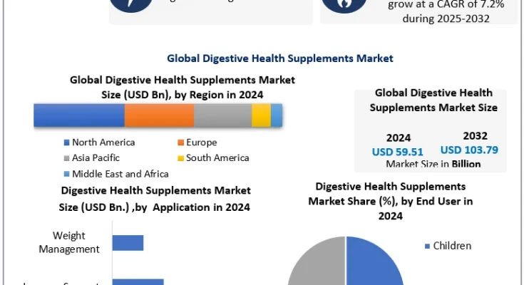 The Global Digestive Health Supplements Market is witnessing significant expansion as consumers increasingly prioritize gut health, immunity, and preventive wellness solutions. According to recent industry analysis, the market was valued at USD 59.51 billion in 2024 and is projected to grow at a CAGR of 7.2% from 2025 to 2032, reaching nearly USD 103.79 billion by 2032.