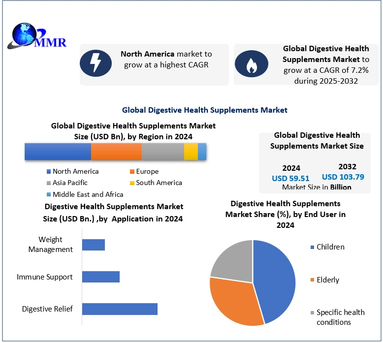 The Global Digestive Health Supplements Market is witnessing significant expansion as consumers increasingly prioritize gut health, immunity, and preventive wellness solutions. According to recent industry analysis, the market was valued at USD 59.51 billion in 2024 and is projected to grow at a CAGR of 7.2% from 2025 to 2032, reaching nearly USD 103.79 billion by 2032.