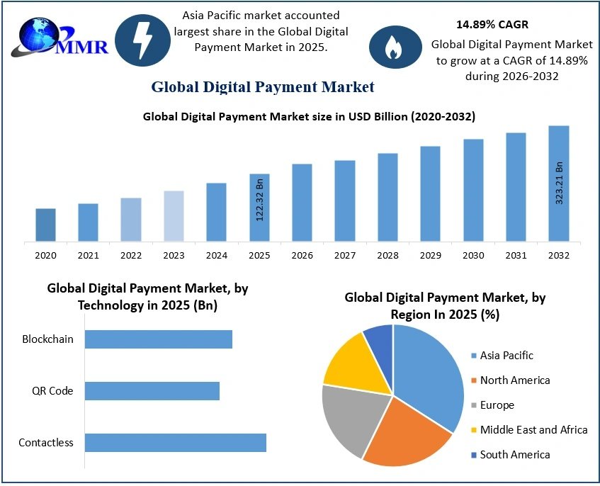 The global Digital Payment Market was valued at USD 122.32 billion in 2025 and is projected to reach approximately USD 323.21 billion by 2032, growing at a CAGR of 14.89% during 2026–2032.