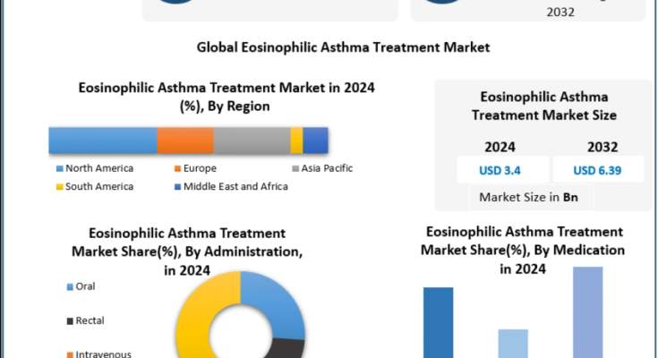 The Eosinophilic Asthma Treatment Market is witnessing steady expansion as the global burden of severe respiratory diseases continues to rise. Valued at USD 3.4 billion in 2024, the market is projected to reach USD 6.39 billion by 2032, growing at a CAGR of 8.2% during the forecast period.