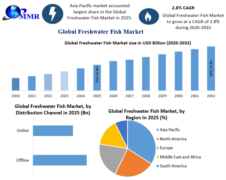The global Freshwater Fish Market is witnessing steady expansion, supported by evolving consumer preferences, increasing aquaculture activities, and technological advancements in fish farming. According to recent market insights, the Freshwater Fish Market was valued at USD 254.95 billion in 2025 and is projected to grow at a CAGR of 2.8% from 2026 to 2032, reaching nearly USD 309.33 billion by 2032.
