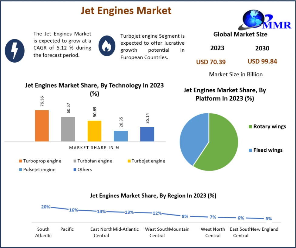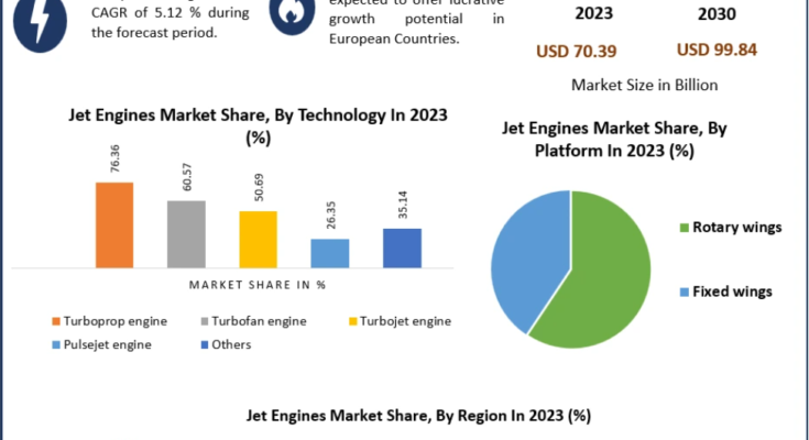 The Jet Engines Market is entering a transformative growth phase, fueled by rising global air travel, expanding airline fleets, and rapid advancements in propulsion technology. Valued at USD 70.39 billion in 2023, the market is projected to grow at a CAGR of 5.12%, reaching nearly USD 99.84 billion by 2030.