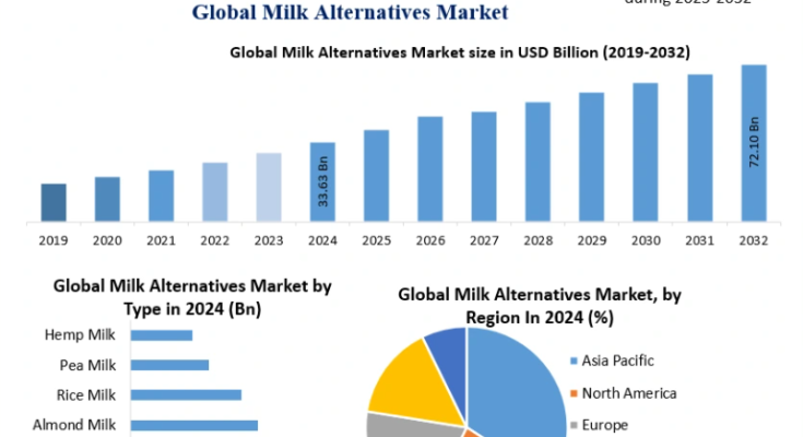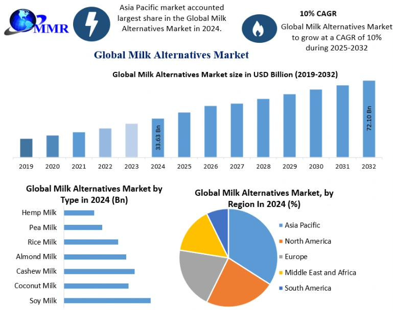 The global Milk Alternatives Market is witnessing remarkable momentum, fueled by evolving consumer preferences, health consciousness, and sustainability considerations. According to the latest market analysis, the market was valued at USD 33.63 Billion in 2024 and is projected to grow at a robust CAGR of 10% during the forecast period from 2025 to 2032, reaching nearly USD 72.10 Billion by 2032.