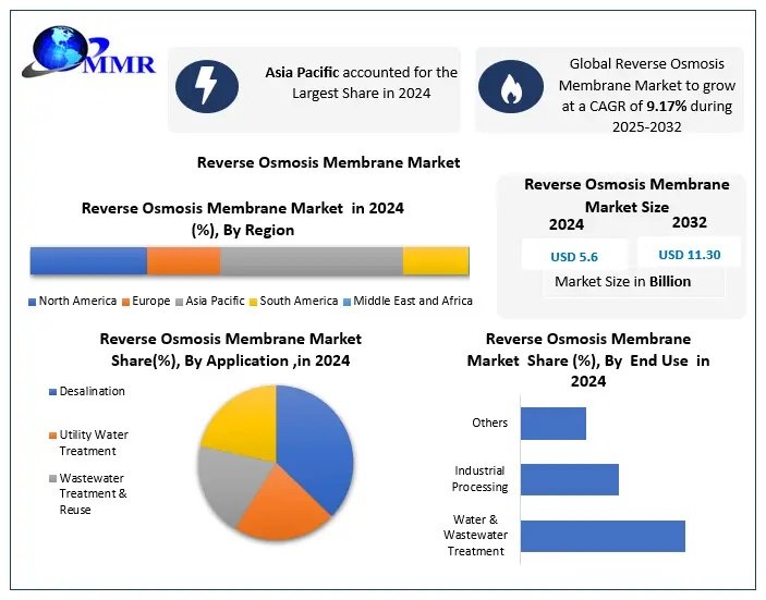 The global Reverse Osmosis Membrane Market was valued at approximately USD 5.6 billion in 2024 and is projected to reach around USD 11.30 billion by 2032, growing at a CAGR of 9.17% during the forecast period (2025–2032).
