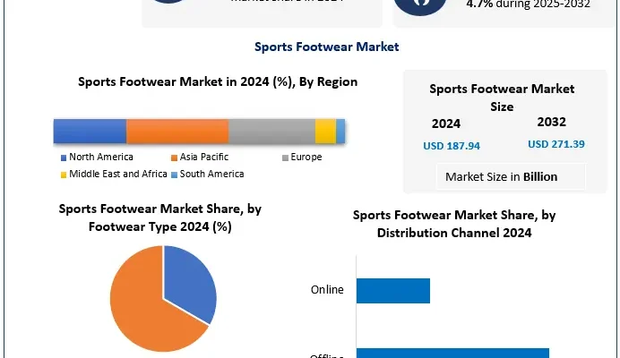 The global Sports Footwear Market is witnessing steady and sustained growth, reflecting the increasing integration of fitness, fashion, and functionality in consumer lifestyles. Valued at USD 187.94 billion in 2024, the market is projected to grow at a CAGR of 4.7% from 2025 to 2032, reaching nearly USD 271.39 billion by 2032. The expansion is fueled by rising sports participation, technological advancements, and the growing popularity of athleisure across global markets.